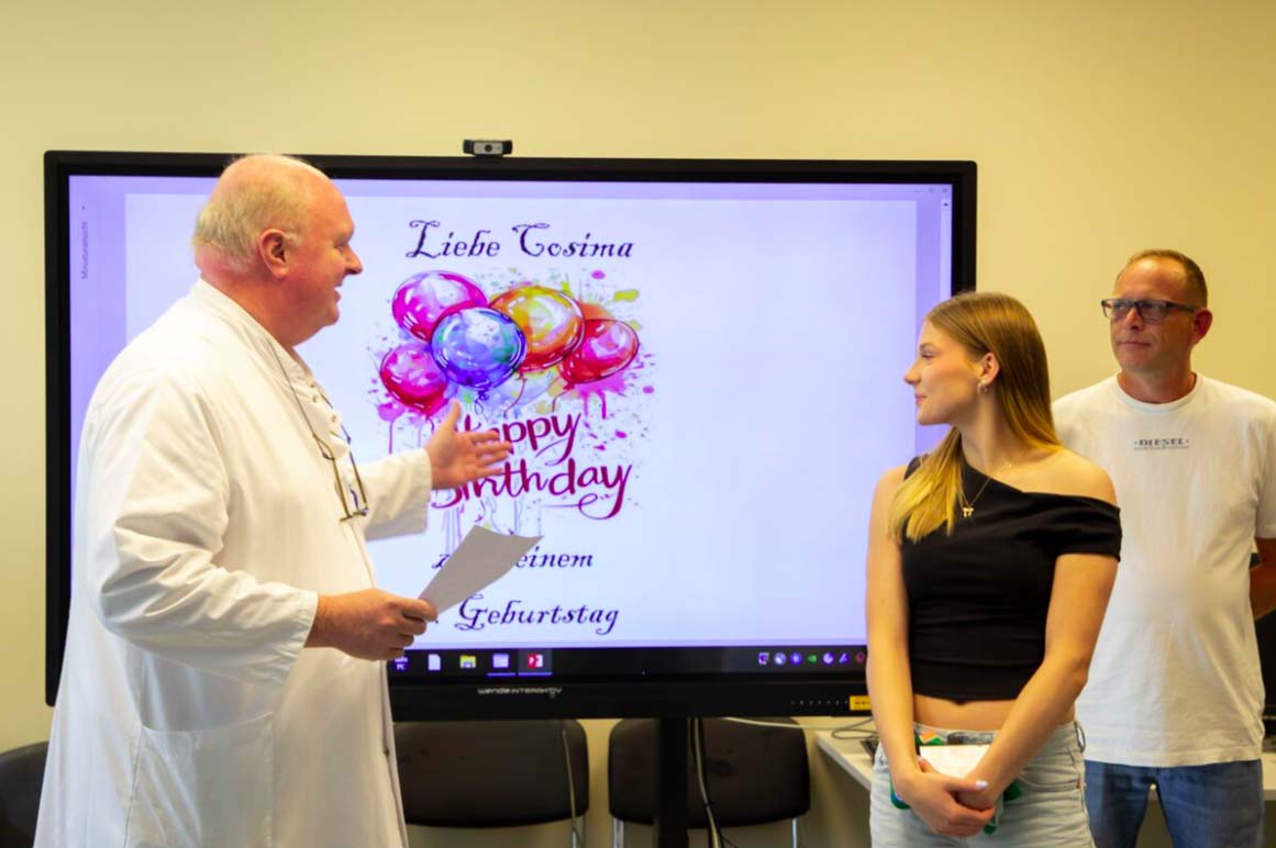 The proceeds from the charity match, amounting to €4,900, were managed in trust by Lohmann. With a smile, he recounted an anecdote: “One day, my wife asked me why I had set up a savings account for a child named Cosima – the bank had sent the mail to my home address. Fortunately, I was able to clear up the misunderstanding!” Those present laughed heartily. Now, 15 years later, the moment had come to hand over the savings to Cosima. Sister Yvonne presented the symbolic check, which will be made out to Cosima on Monday afternoon. “This money is intended to give you a small start for your future – in memory of your mother,” emphasized Prof. Lohmann.